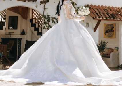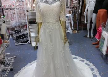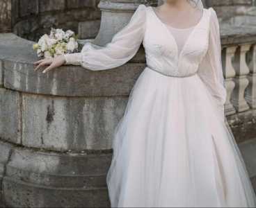 Продам свадебное платье размера 42-44 Белое платье с кружевным верхом и длинными рукавами. Платье в хорошем состоянии.