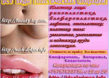 Все виды пластических операций: SMAS лифтинг; пластика век (блефаропластика), ушных раковин (отопластика), носа...