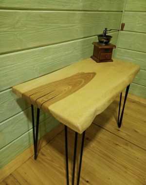 Небольшой столик из слэба ясеня на четырёх металлических ножках. Можно использовать как журнальный или кофейный.